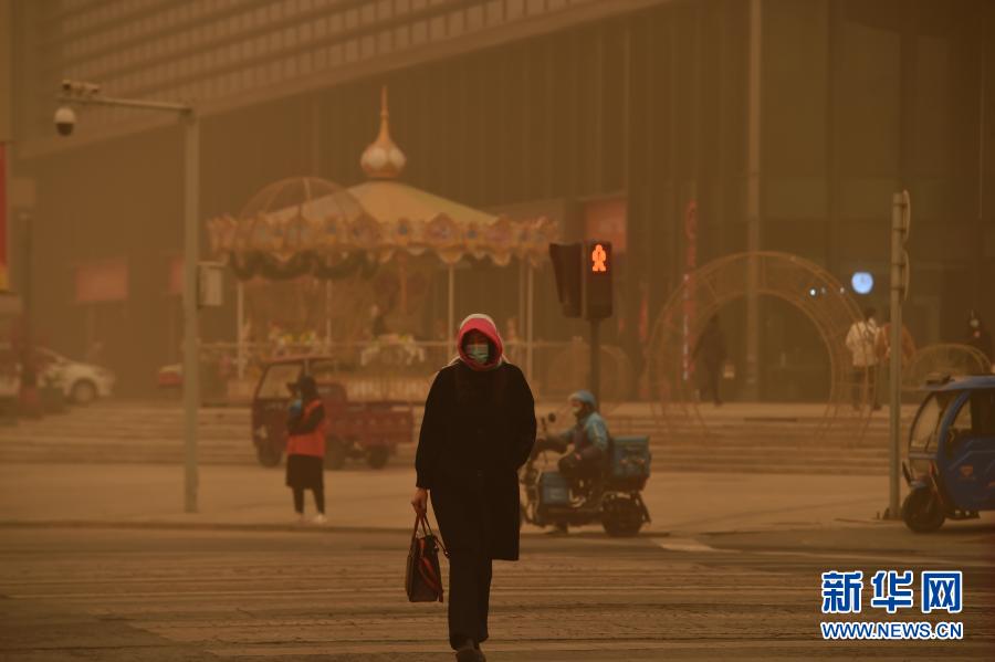 3月15日,寧夏銀川市民在沙塵中通過十字路口。當日,我國北方多地出現(xiàn)沙塵天氣。新華社記者 唐如峰 攝