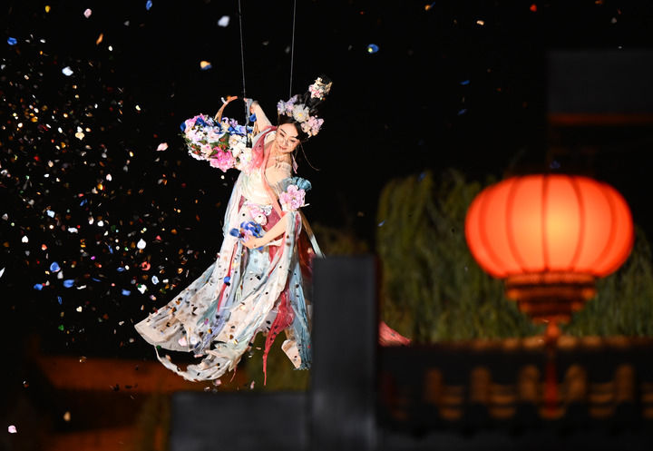2025年12月4日,演员在洛阳洛邑古城景区表演“天女散花”。