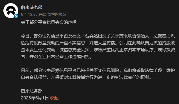 6月1日晚,针对网传蔚来总裁秦力洪持股数量变动的消息,蔚来法务部发文进行辟谣。