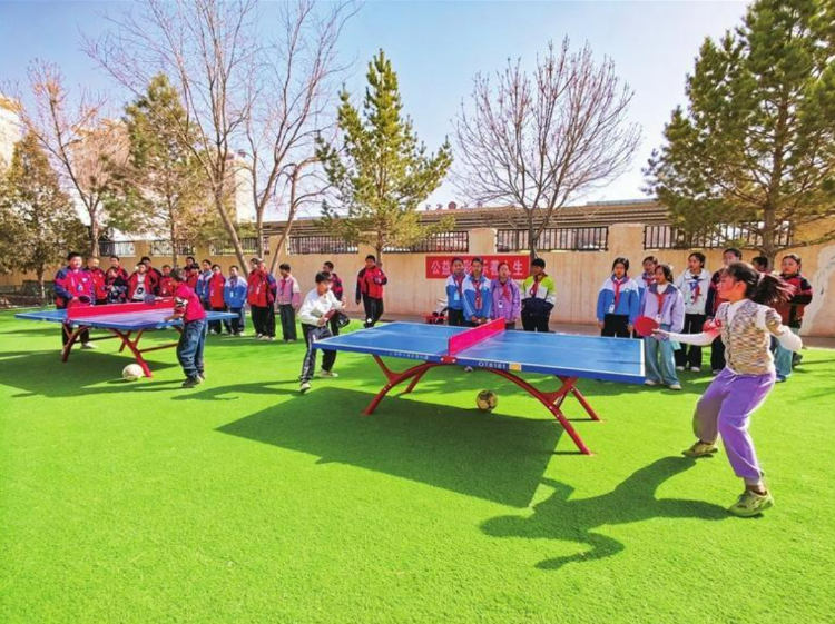 在武威市民勤县南关小学,体育老师耐心讲解篮球运球投篮、足球盘带射门、乒乓球推挡要领及花样跳绳技巧。绿茵场上、乒乓球台前和操场中央,孩子们的欢声笑语汇成校园最美乐章。