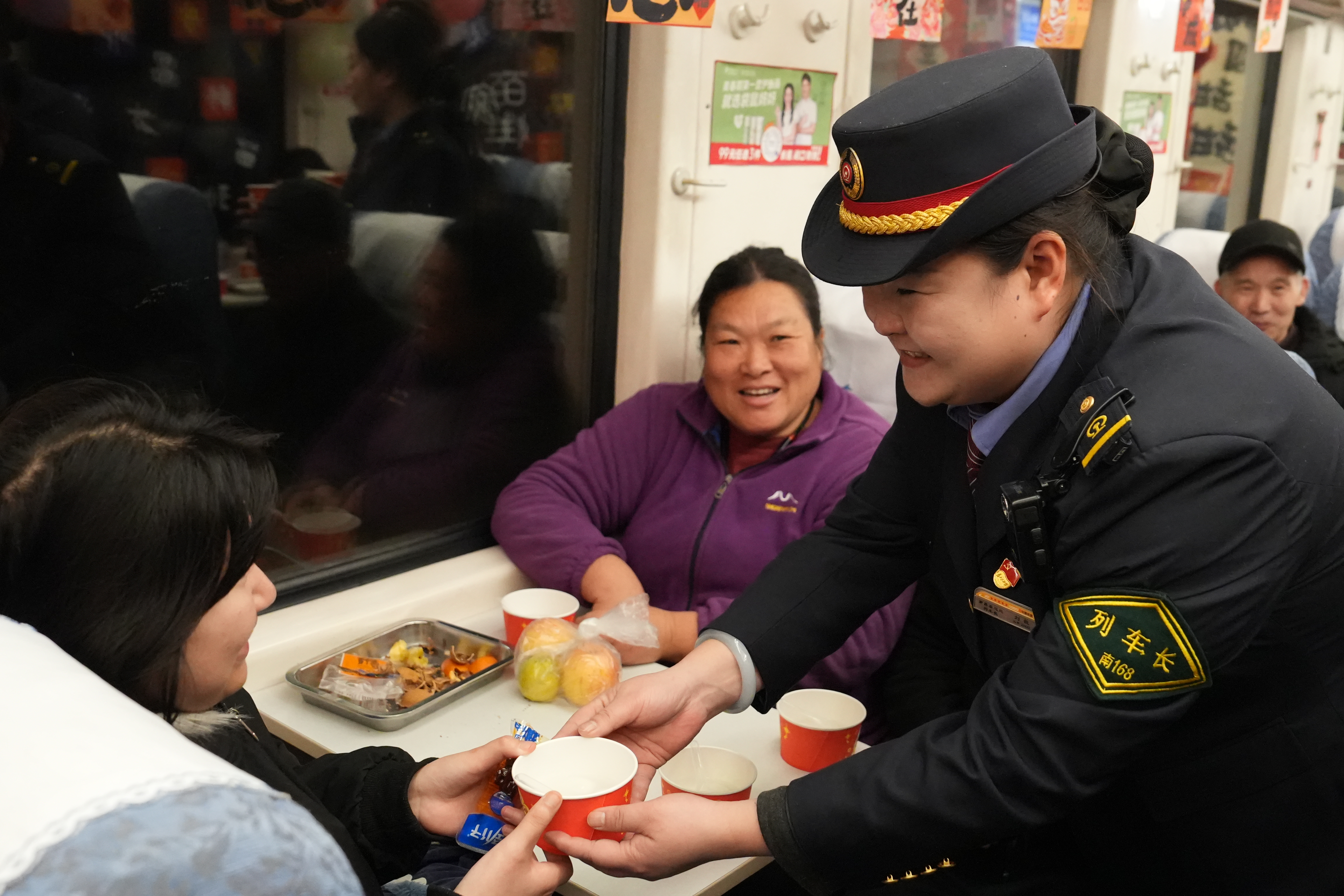 一踏入车厢,浓浓的节日气息便扑面而来。红色灯笼在行李架上摇曳生姿,剪纸窗花在玻璃窗上绽放春意,彩带如流星般穿梭在车厢之间,处处洋溢着喜庆与祥和。