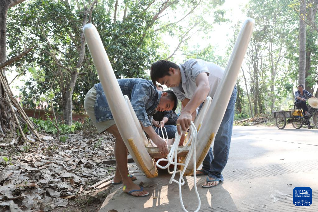 4月1日,景洪市勐罕镇曼搭村村民在检查龙舟。