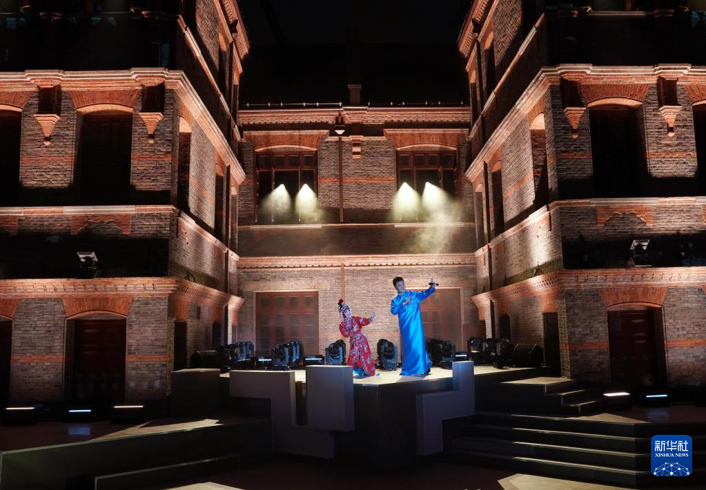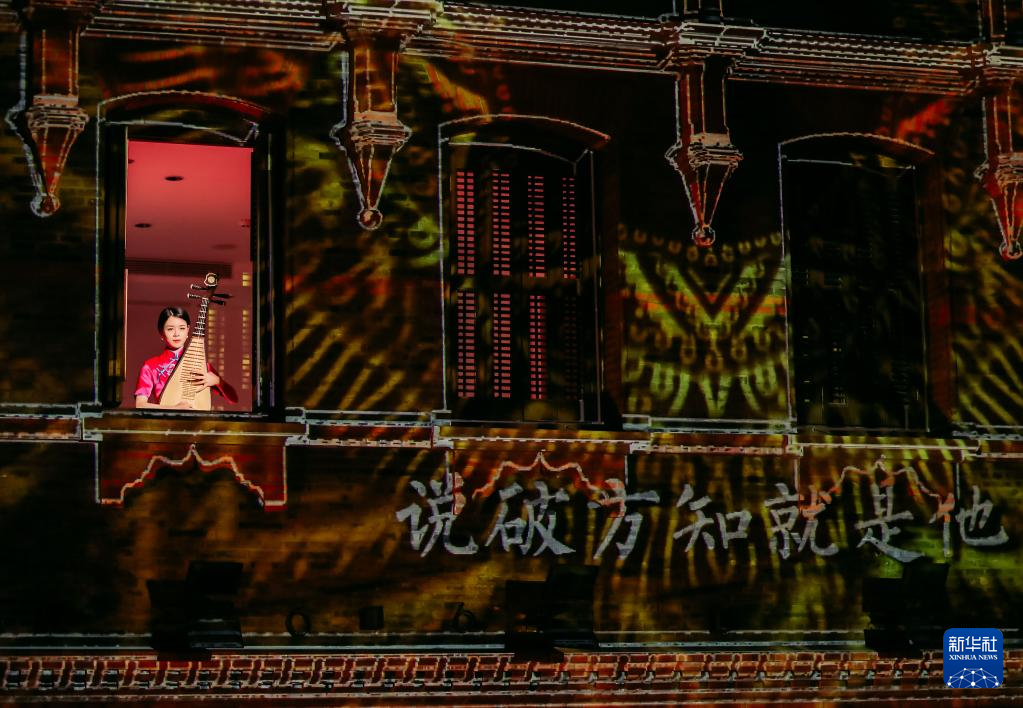 优秀历史建筑“三联排”在声光影效果中,成为如梦似幻的戏曲舞台(4月14日摄)。