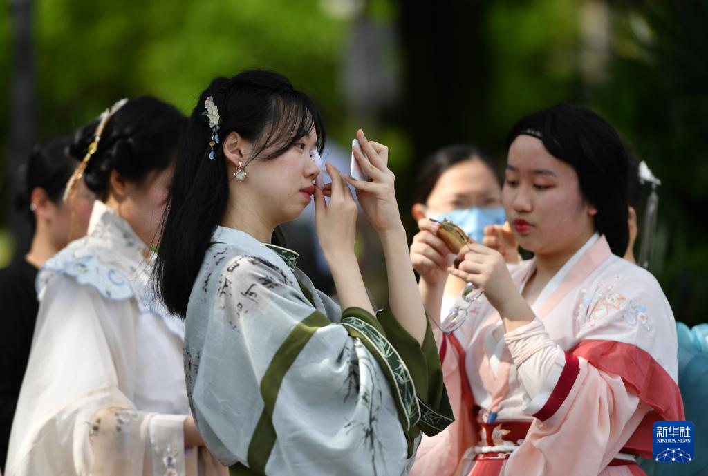4月15日,在福州西湖上巳节启动仪式现场,汉服爱好者在进行演出前的妆扮。
