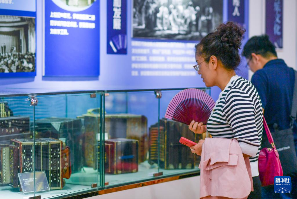 5月18日,在位于伊宁市六星街的亚历山大手风琴珍藏馆,游客在参观展出的手风琴。