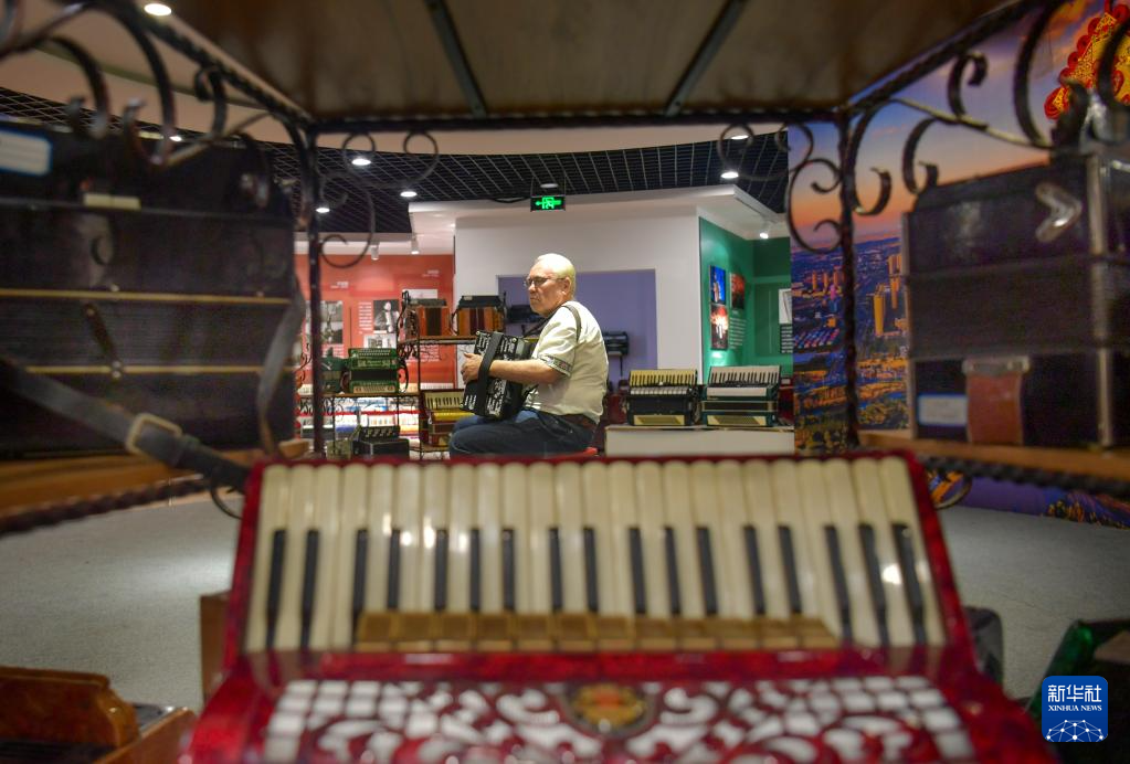 5月18日,在位于伊宁市六星街的亚历山大手风琴珍藏馆,一位乐手在为游客表演。