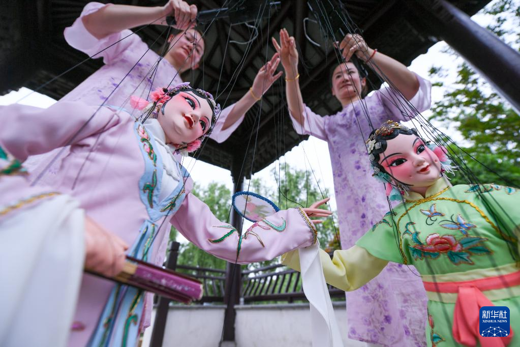 孙菁和施锦芳在苏州市吴江区七都镇一处公园内进行排练(4月18日摄)。他们手提十多根线操纵着约六十厘米高、七八斤重的木偶,通过手指、形体动作来操控木偶的动作神态。