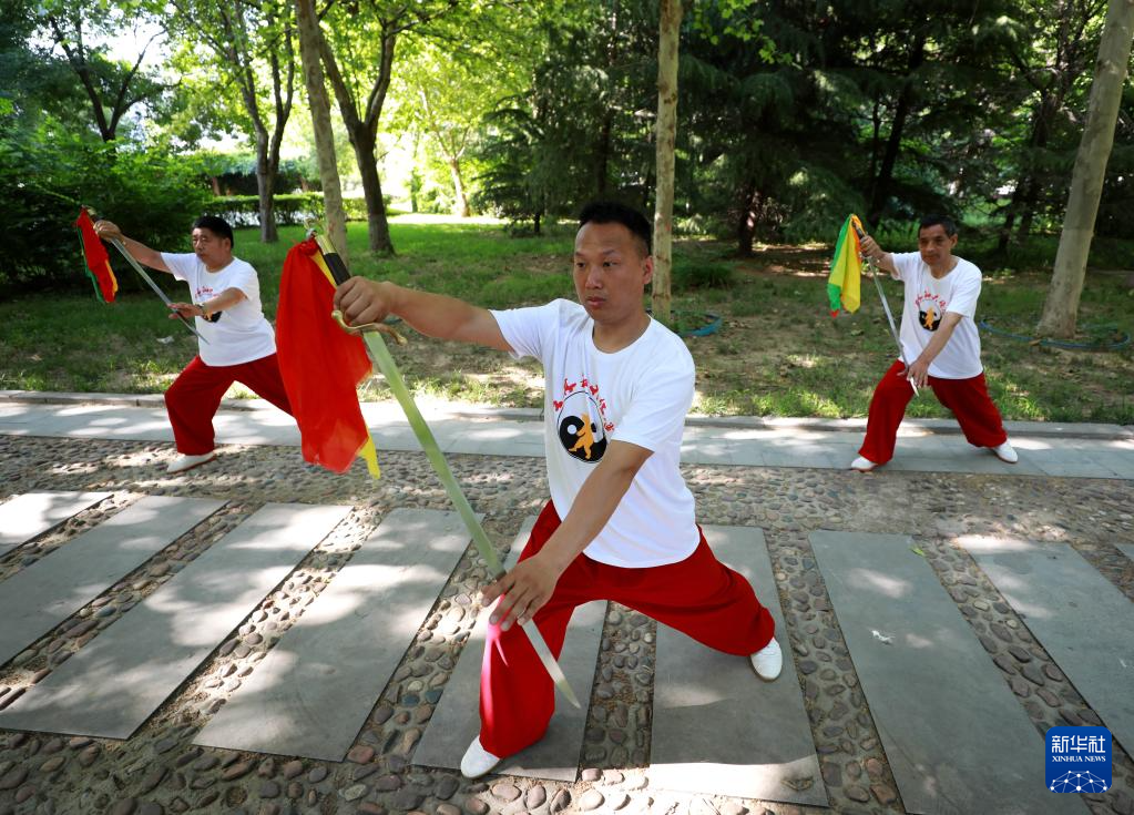 6月9日,太极拳爱好者在河北省邢台市任泽区人民广场展示王其和太极拳器械太极剑。
