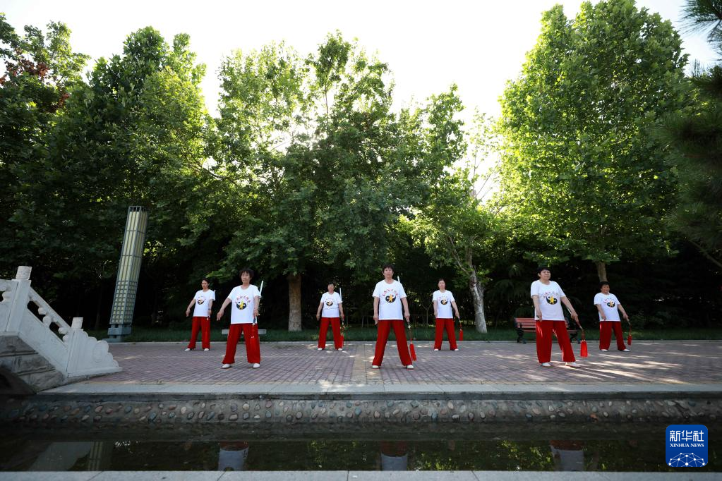 6月9日,太极拳爱好者在河北省邢台市任泽区人民广场展示王其和太极拳器械太极刀。