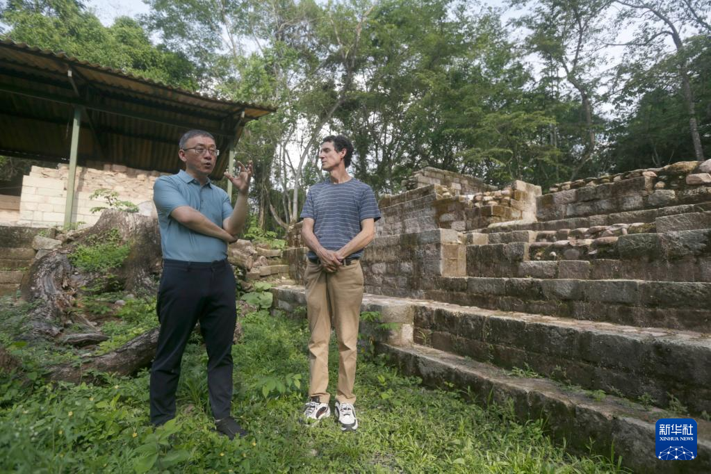 6月8日,在洪都拉斯科潘玛雅遗址8N-11号贵族院落遗址,中国社科院考古研究所“玛雅文明中心科潘遗址考古及中美洲文明研究”项目中方负责人李新伟(左)与洪方负责人拉莫斯交谈。新华社发(卢西奥·塔沃拉摄)