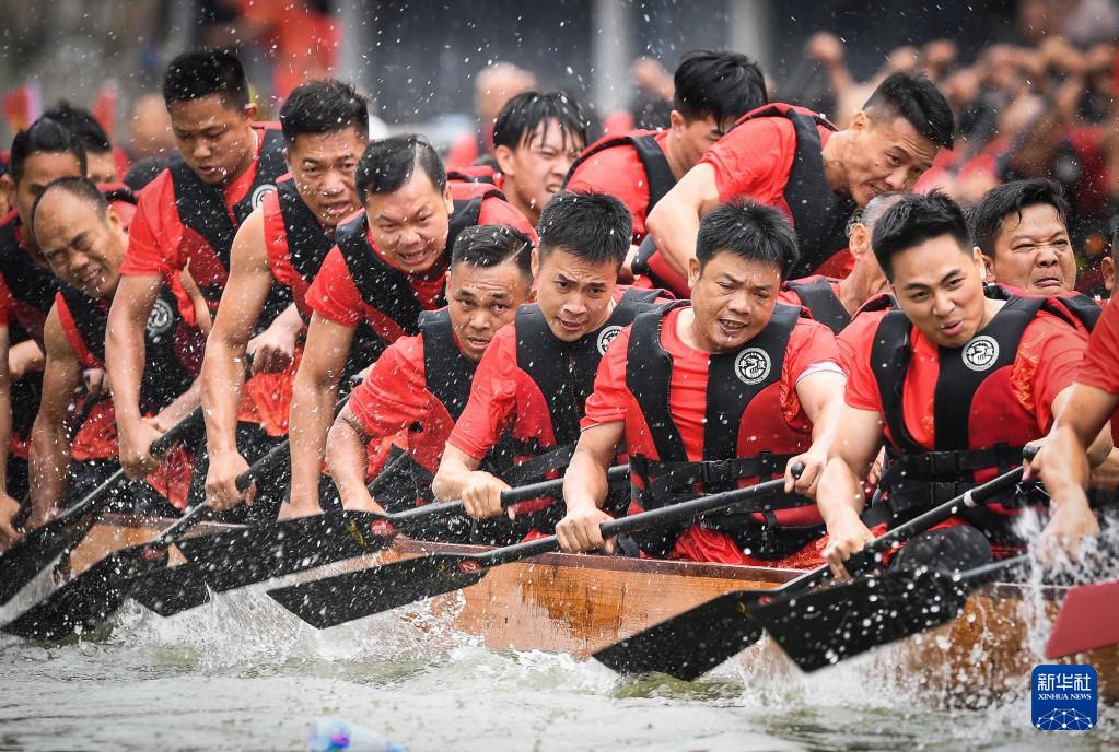 6月15日,在车陂龙舟竞渡赛场上,划手们全力扒桨奋勇争先。