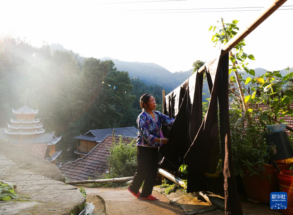乌英苗寨妇女在亮布文化小广场上晾晒亮布(2023年9月2日摄)。