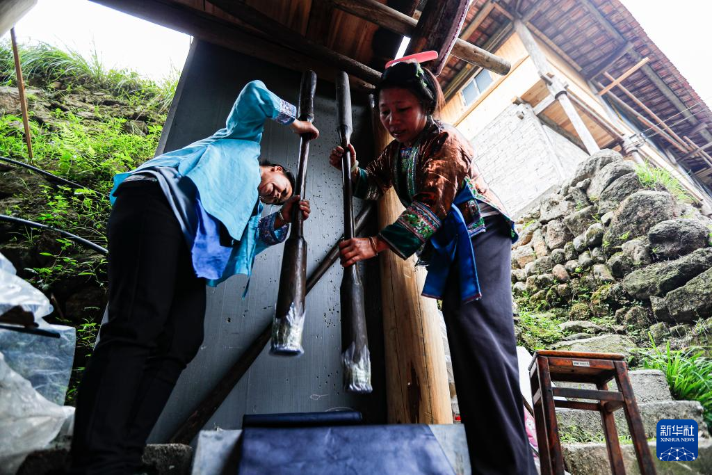 乌英苗寨妇女梁足英(右)在用传统亮布槌捶打布料(2023年8月31日摄)。