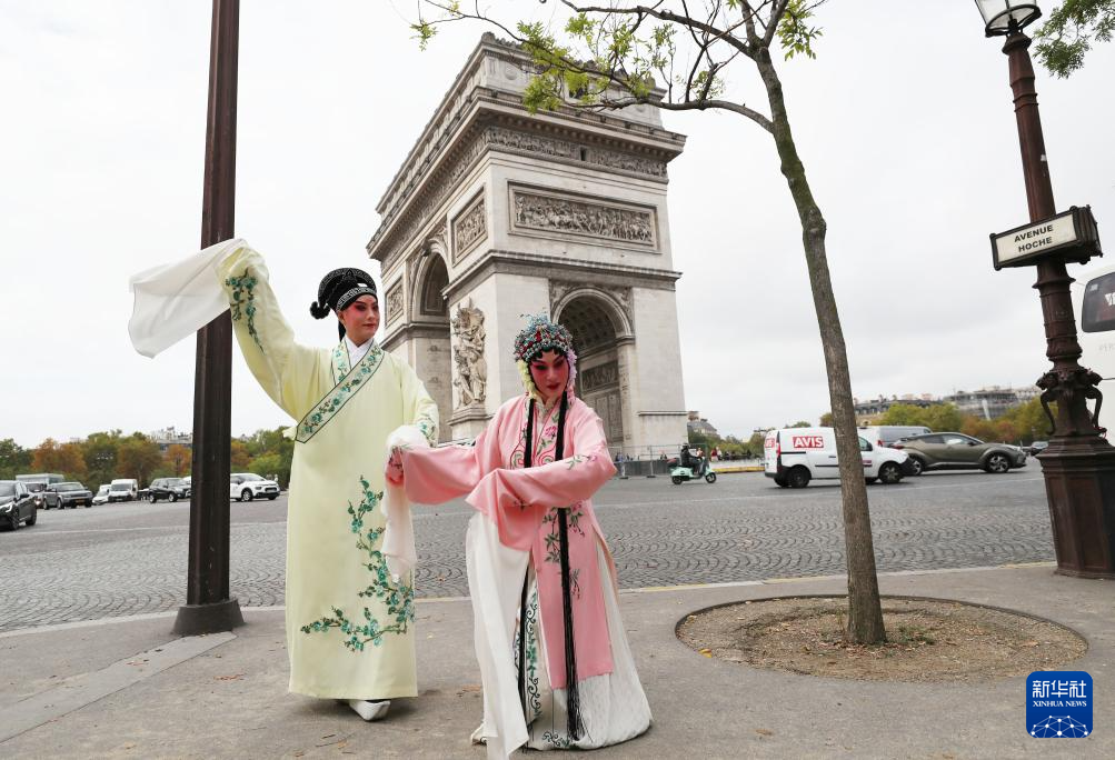 9月13日,江苏省演艺集团昆剧院院长施夏明(左)和江苏省演艺集团昆剧院国家一级演员孔爱萍在法国巴黎凯旋门附近参加昆曲快闪。