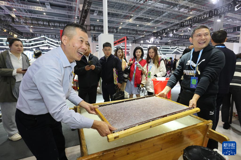11月16日,在安徽展区,人们在师傅(左)的指导下现场体验宣纸制作。