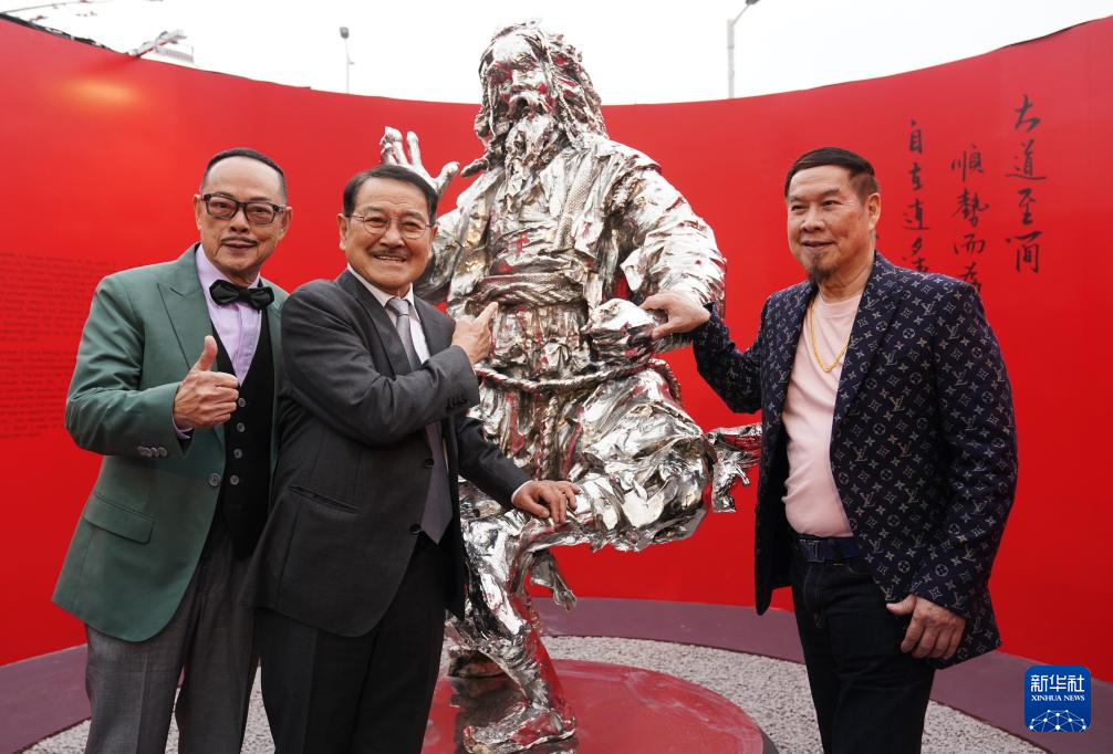 3月15日,在香港中环,曾经饰演过金庸武侠人物的香港演员在雕塑前留影。新华社记者 王申 摄