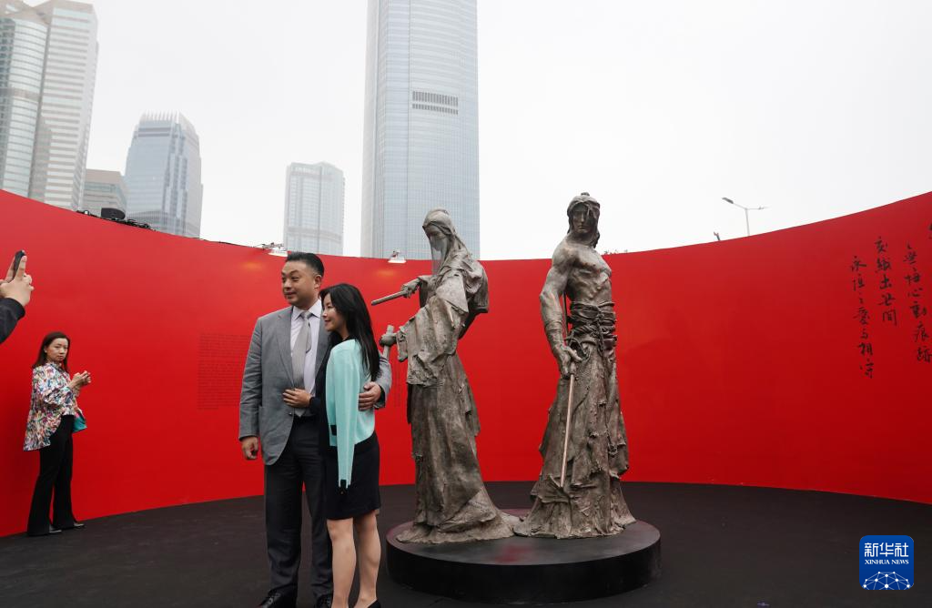 3月15日,在香港中环,市民在由雕塑家任哲创作的金庸武侠人物雕塑前留影。新华社记者 王申 摄