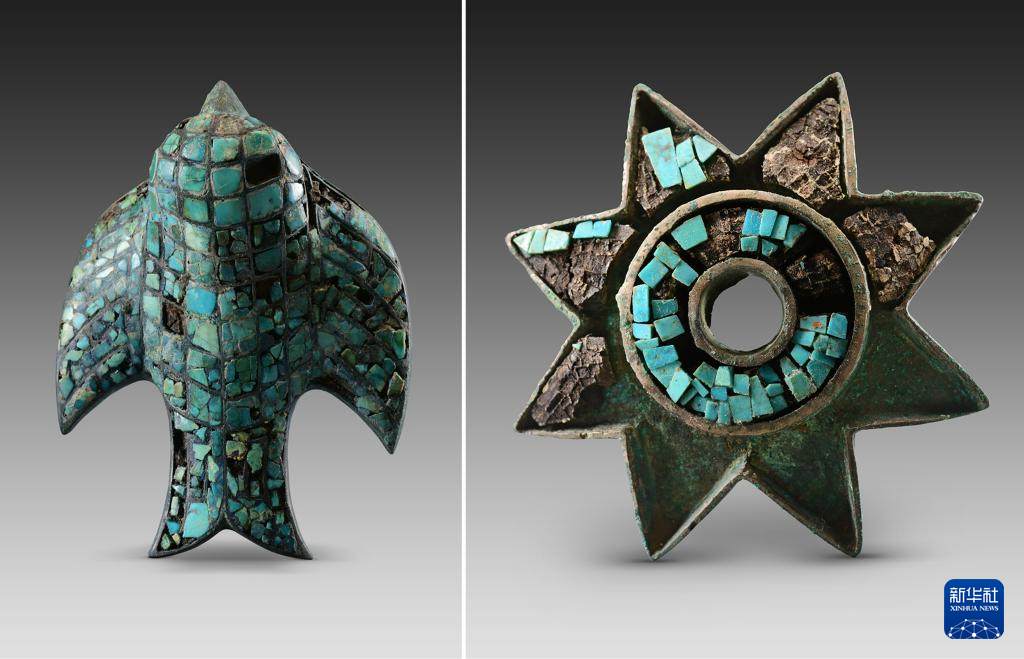 陕西清涧寨沟遗址后刘家塔墓地出土的镶绿松石铜饰(拼版照片)。