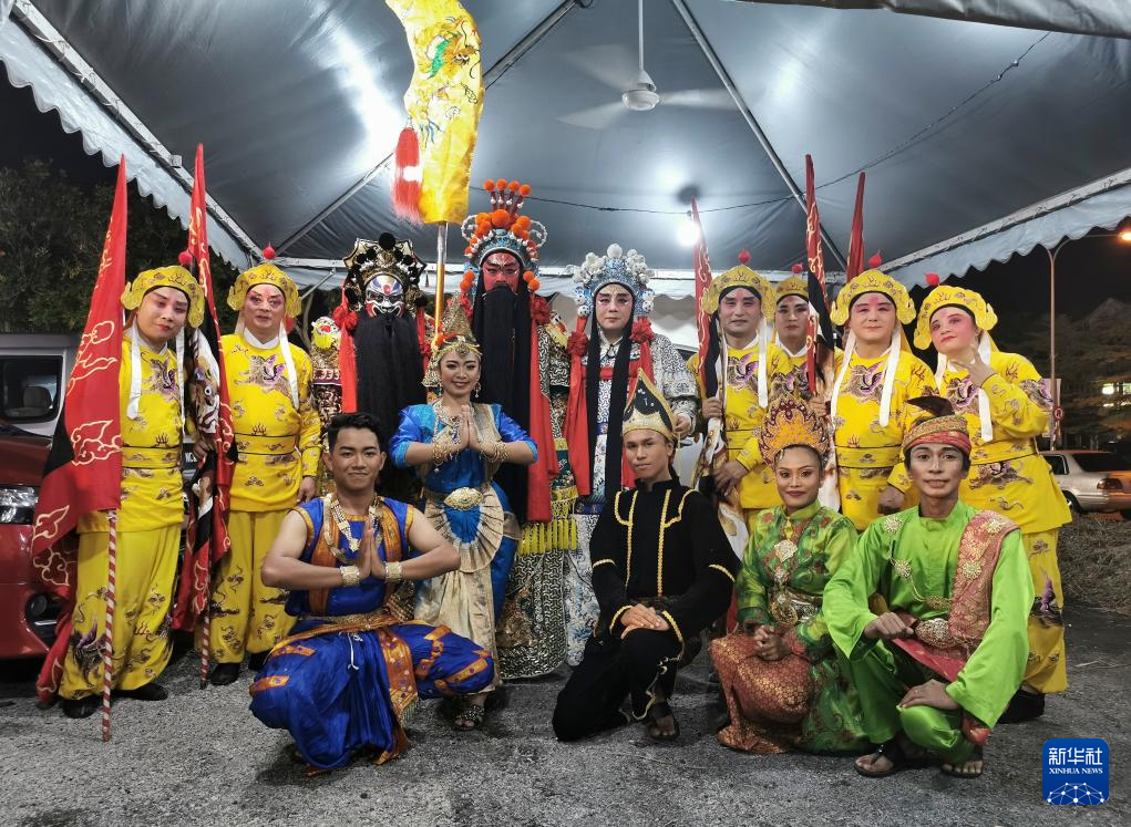 武凌云(后排左四)和团队成员参加马来西亚国际关公文化节时与当地演员合影(2019年10月23日摄)。