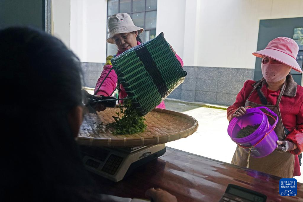 江西省修水县漫江乡的宁红茶制茶基地,茶农将采摘的鲜叶交给制茶车间称重(3月29日摄)。