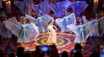 5月19日,游客在西安长安十二时辰景区观看表演《霓裳羽衣舞》。