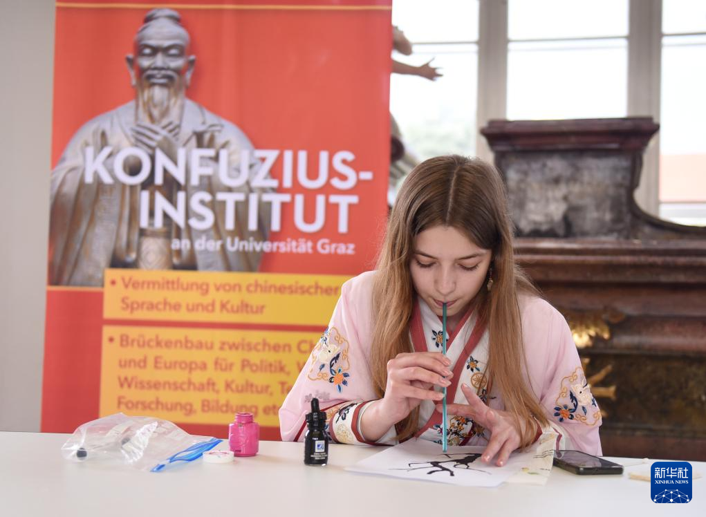 5月25日,选手在维也纳举行的“汉语桥”奥地利赛区比赛上表演吹墨画。