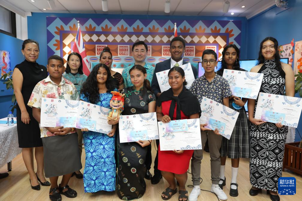 6月8日,在斐济首都苏瓦,“汉语桥”世界中学生中文比赛斐济赛区参赛选手和嘉宾合影。