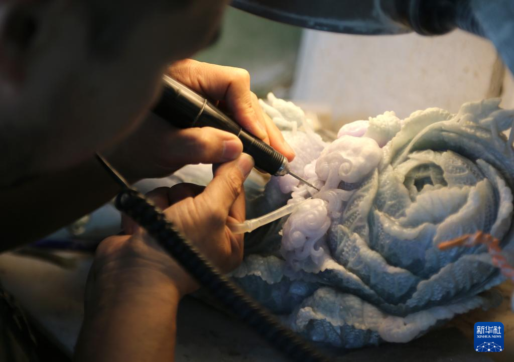 张铁成在工作室内进行玉雕创作(6月15日摄)。