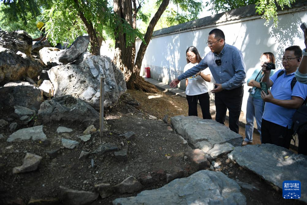 9月22日,北京市考古研究院工作人员向活动参与者介绍文源阁遗址中的蹬道遗迹。