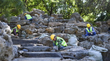 改造升级后松木场农贸市场装饰墙上的鱼篓等物件(9月23日摄)。