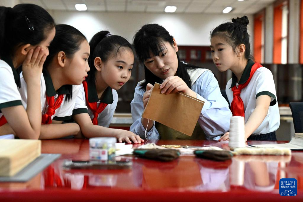 4月21日,古籍修复师在石家庄市图书馆为石家庄市实验小学学生展示古籍装订技艺。