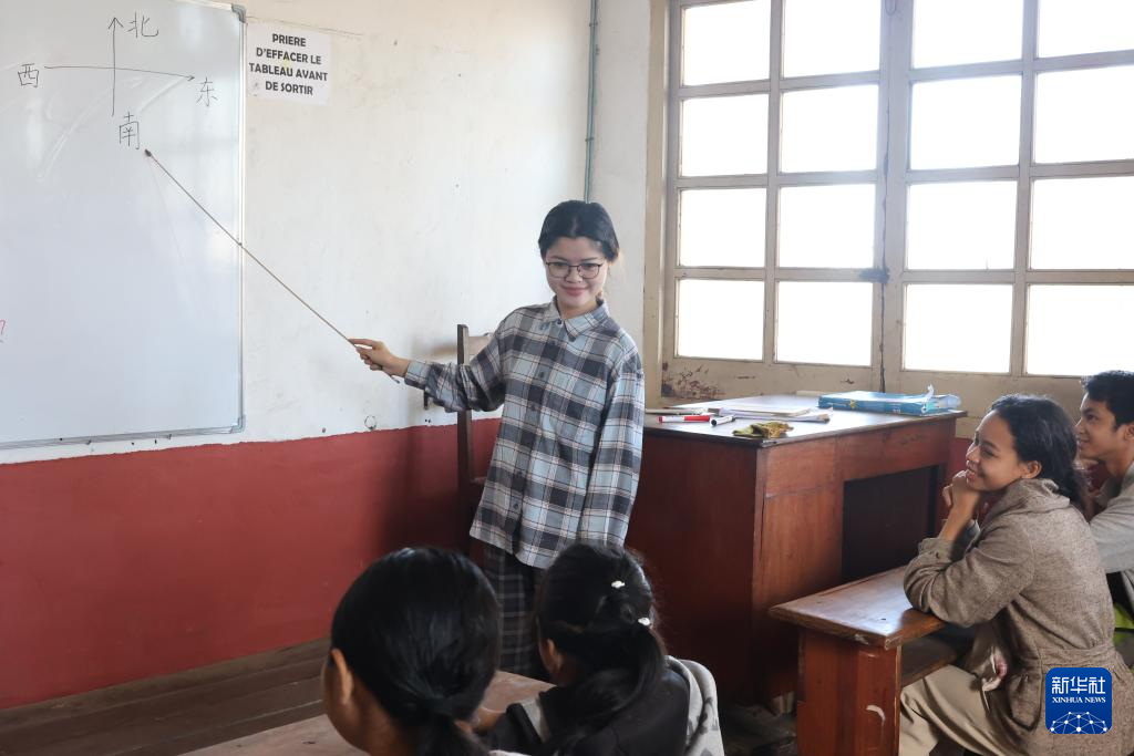 7月12日,在马达加斯加图阿马西纳,塔马塔夫大学孔子学院志愿者葛雪在塔马塔夫华侨学校给学生讲课。新华社发(西塔卡·拉乔纳里松摄)
