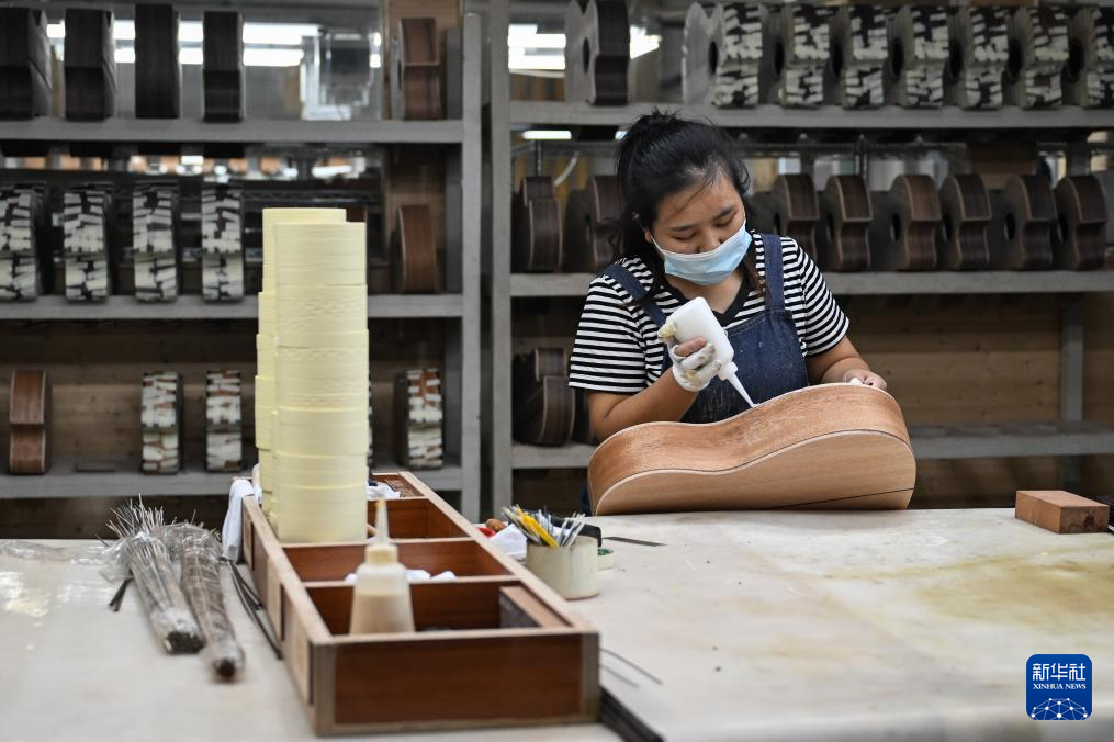 8月28日,在湖北省松滋市一家吉他企业生产车间,工人在制作吉他。