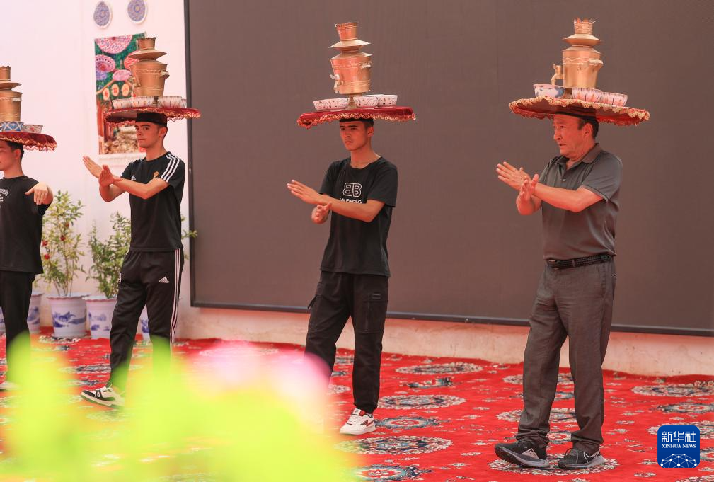 7月22日,在新疆库车市的龟兹小巷,演员表演顶碗舞。