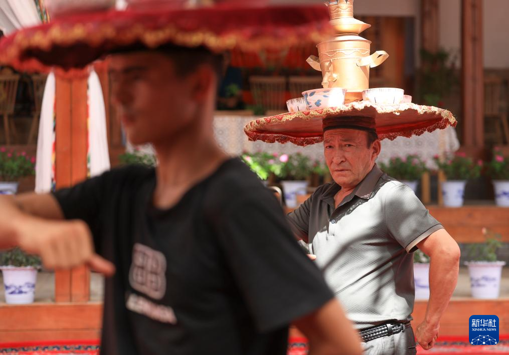 7月22日,在新疆库车市的龟兹小巷,民间艺人帕尔哈提(右一)在给年轻舞者教授萨玛瓦尔舞动作要领。