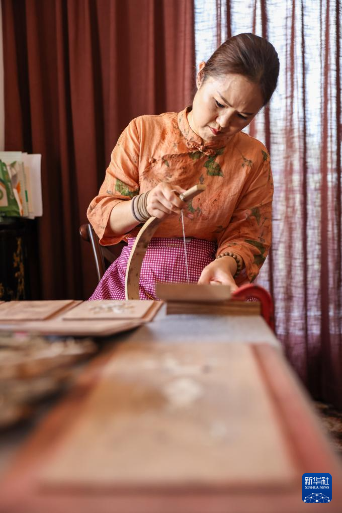 10月15日,胡蓉在孔浦街道怡江社区的非遗工作室内展示骨木镶嵌技艺。