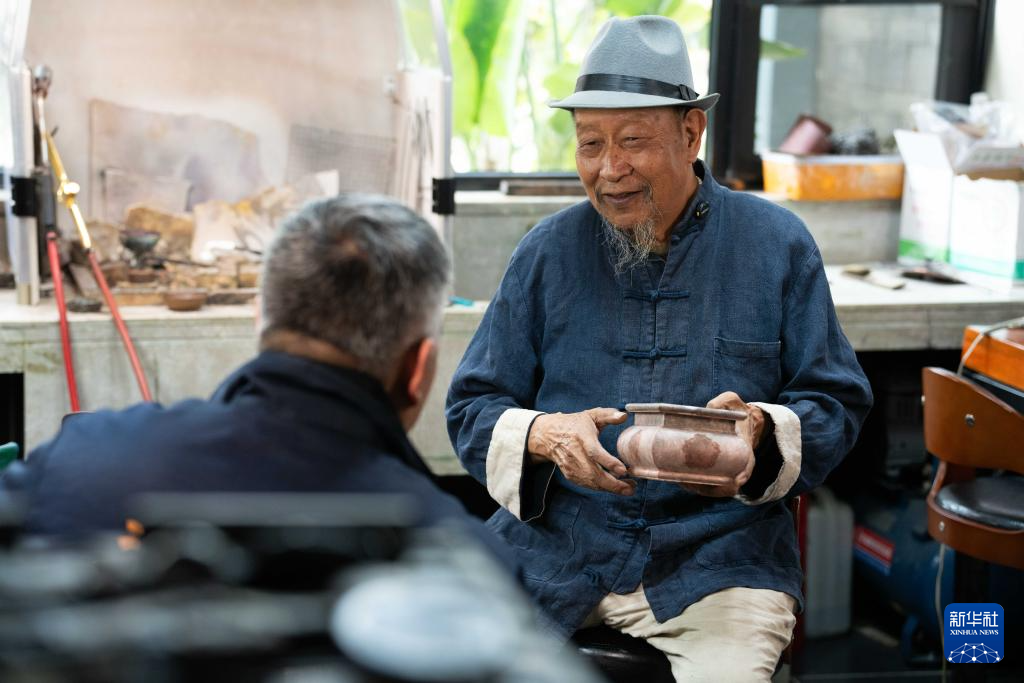 10月25日,在昆明乌铜走银传习馆,金永才(右)与弟子交流。