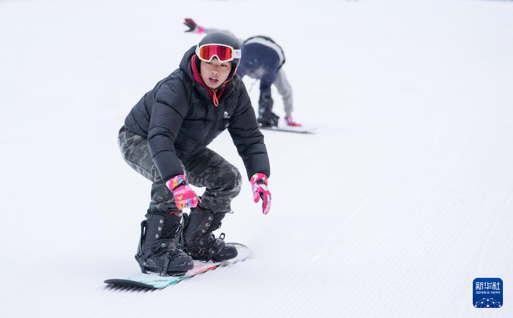 12月8日,游客在阿坝州汶川县羌人谷滑雪场滑雪。