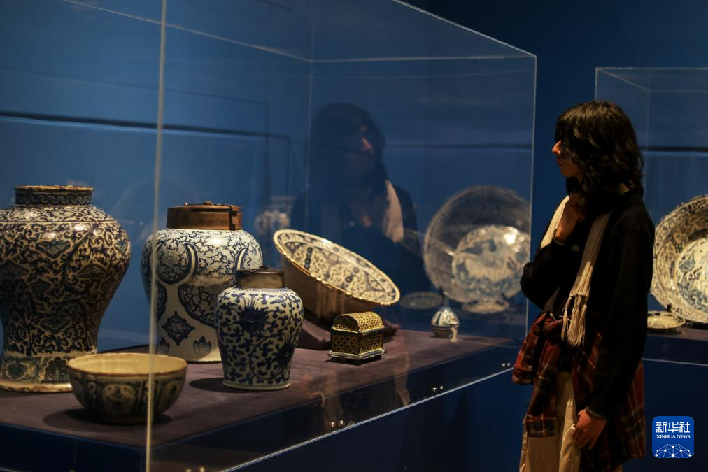 12月17日,在墨西哥首都墨西哥城举行的马尼拉大帆船主题展上,一名女子观看墨西哥当地陶器和中国明清时期瓷器。