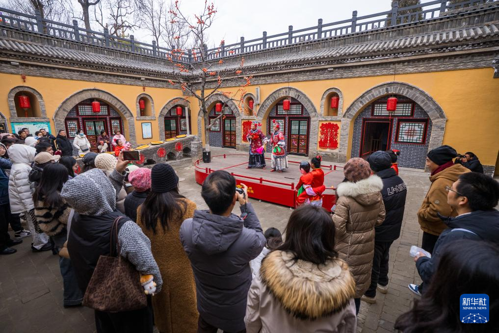 12月21日,游客在河南省三门峡市陕州区张汴乡北营村地坑院欣赏社火表演。