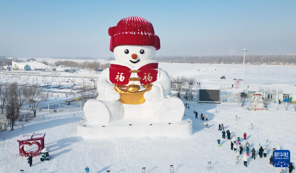 12月24日在哈尔滨外滩德嘉雪人码头冰雪景区拍摄的大雪人(无人机照片)。