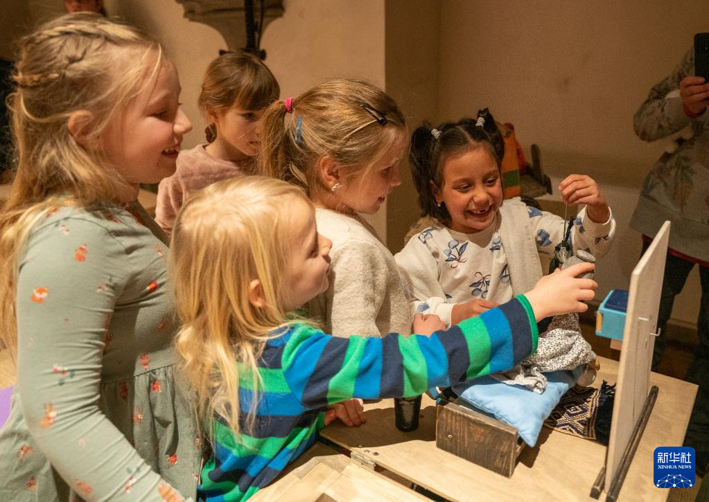 1月10日,孩子们在捷克布拉格博物馆玩木偶。