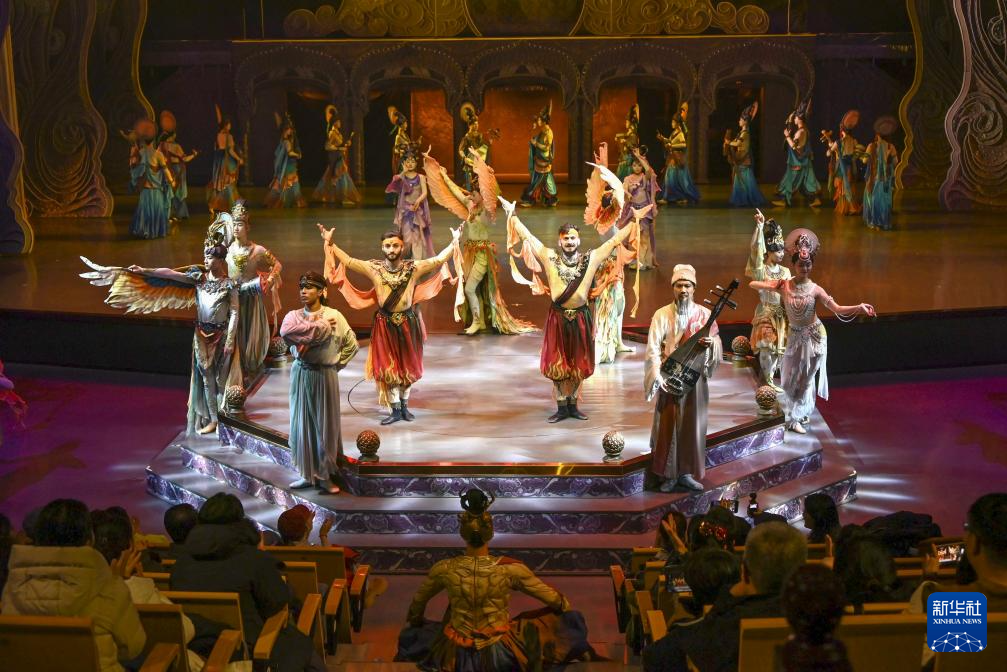 2026年1月9日,游客在甘肃敦煌观看大型洞窟沉浸式体验剧《乐动敦煌》。
