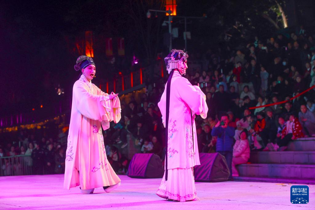2025年12月19日,江苏省苏州昆剧院演员在重庆市黔江区武陵水岸表演昆曲《牡丹亭·惊梦》。