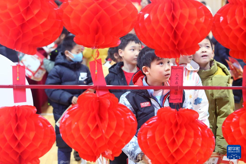 1月21日,北京小学学生在“小花蕾过大年”期末实践活动上猜灯谜。