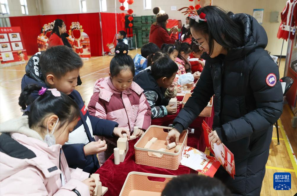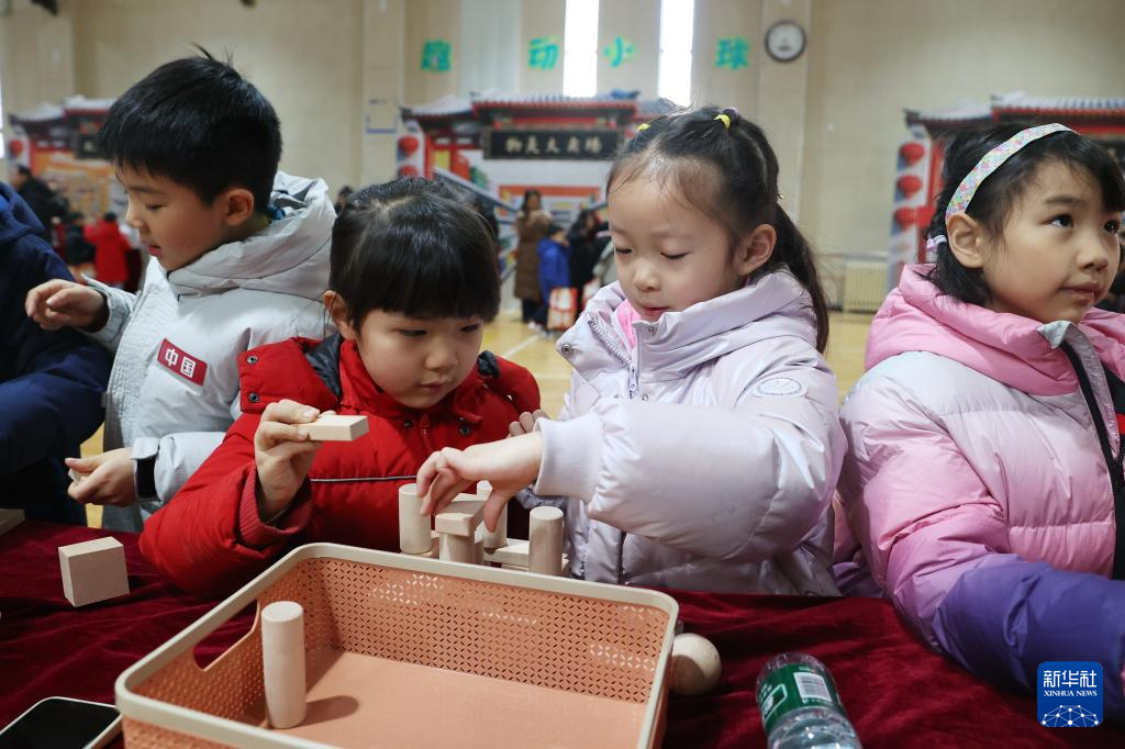 1月21日,北京小学学生在“小花蕾过大年”期末实践活动上搭积木。