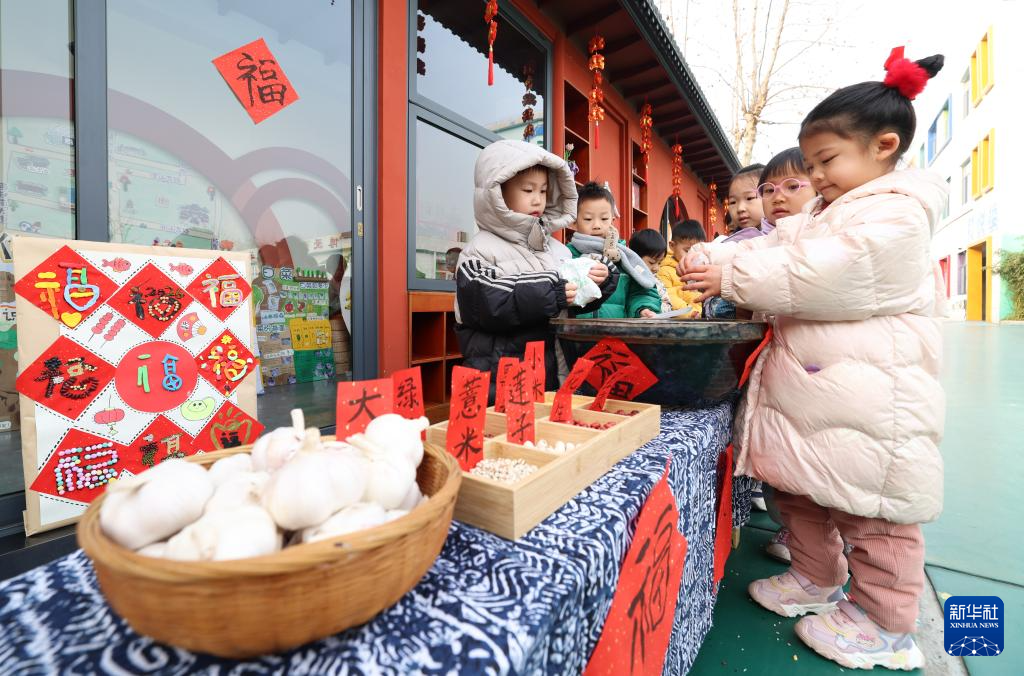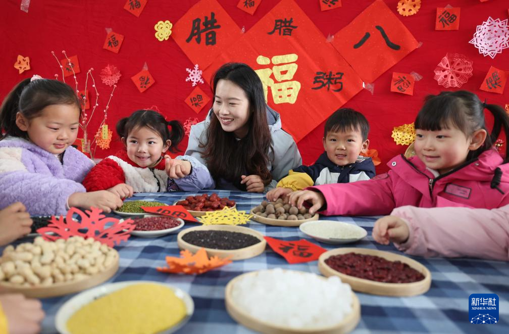 1月26日,在河北省石家庄市正定县幼儿园,小朋友们准备腊八粥食材。