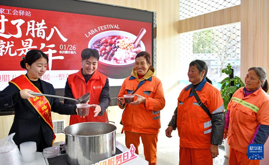 1月26日,在浙江省台州市仙居县城区一家工会驿站内,志愿者为环卫工人送上腊八粥。