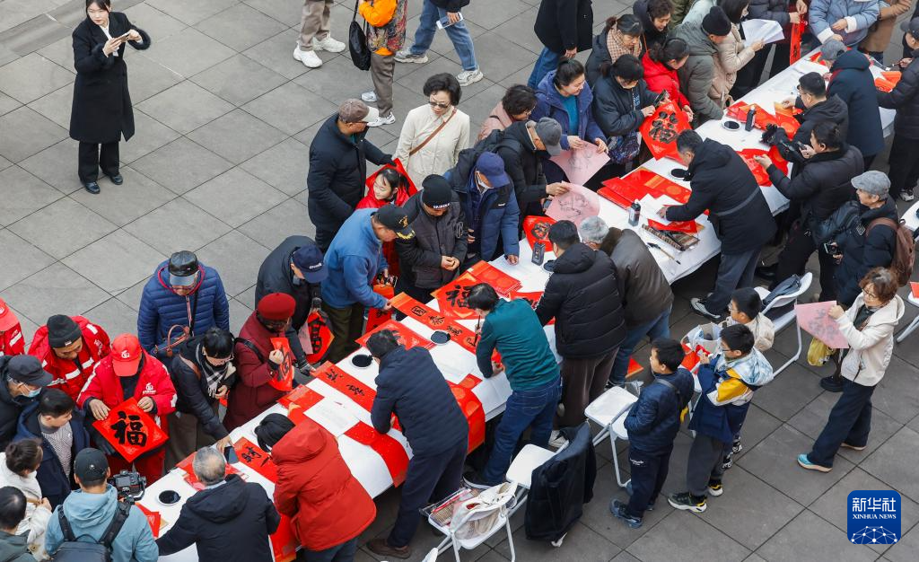 2月4日,在江苏省南京市鼓楼区立春送福活动现场,书法家为市民和游客书写福字和春联。