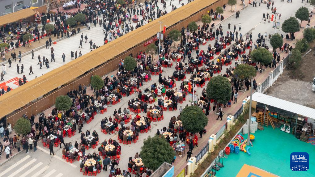 这是2月4日拍摄的贵州省石阡县“乡厨”大赛期间进行的吃刨汤宴活动(无人机照片)。